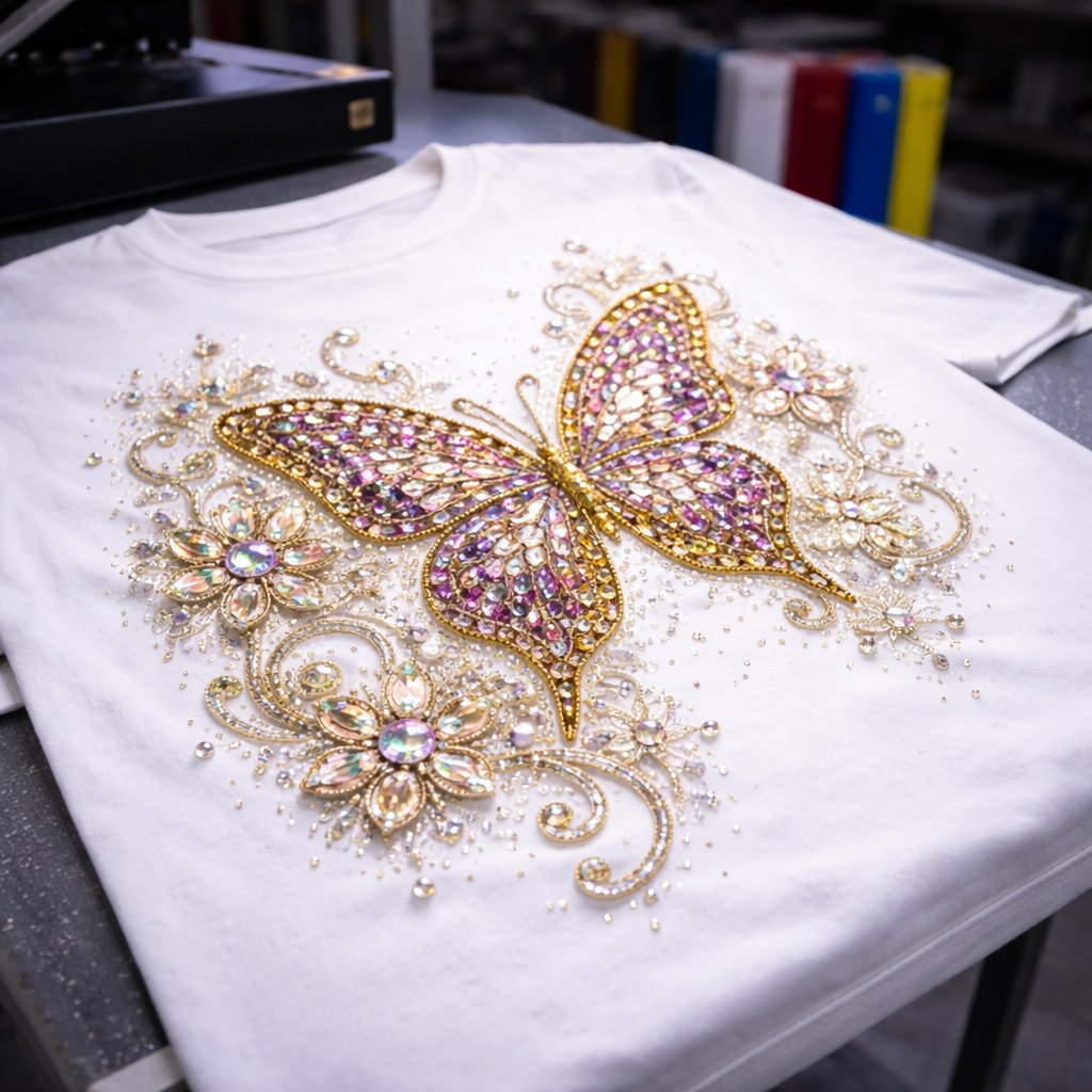 O hot fix utiliza aplicação de pedras ou elementos brilhantes, criando um efeito sofisticado e elegante.