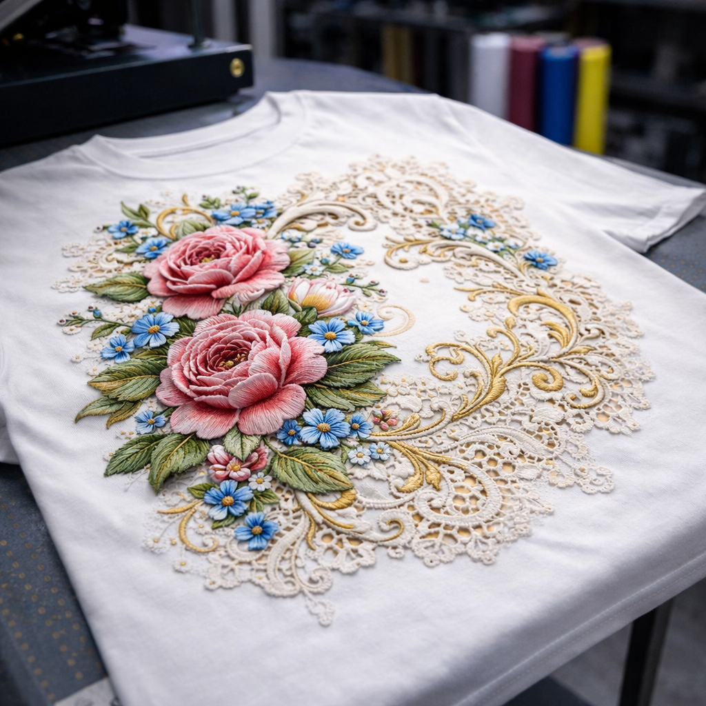 Essa técnica permite reproduzir o visual de bordados ou rendas com menor custo e maior agilidade de produção.