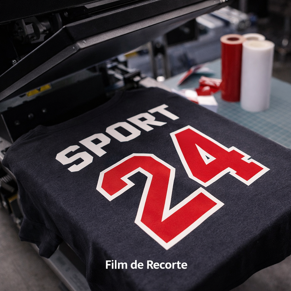 O film de recorte é uma técnica que utiliza películas especiais para criar estampas com acabamento preciso e cores sólidas. É muito utilizado em personalizações e aplicações específicas.
